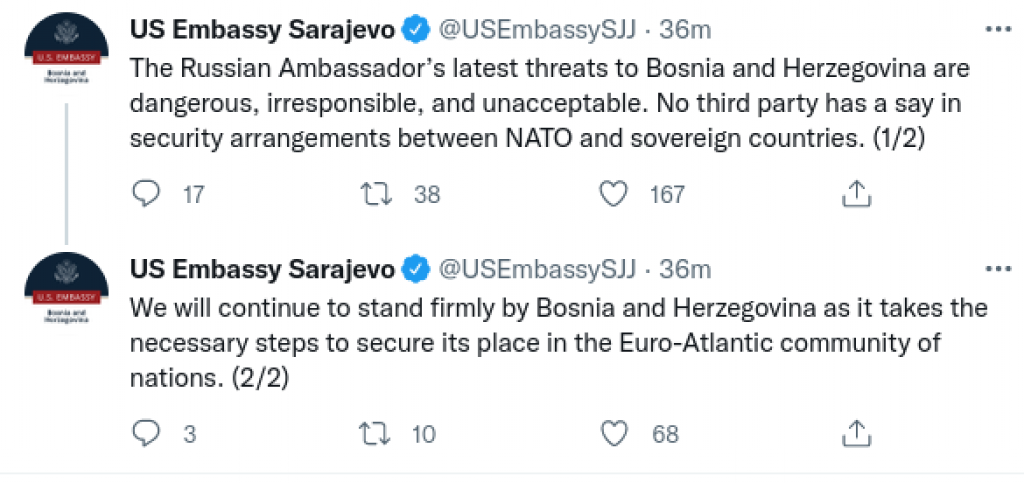 Posljednje prijetnje ruskog ambasadora Bosni i Hercegovini su opasne, neodgovorne i neprihvatljive. Nijedna treća strana nema pravo glasa u sigurnosnim aranžmanima između NATO-a i suverenih zemalja, navodi Ambasada Sjedinjenih Američkih Država na svom Twitter nalogu, kao reakciju na prijetnje koje je ruski ambasador u BiH izrekao u intervjuu za FTV koji je emitovan 15. marta.
