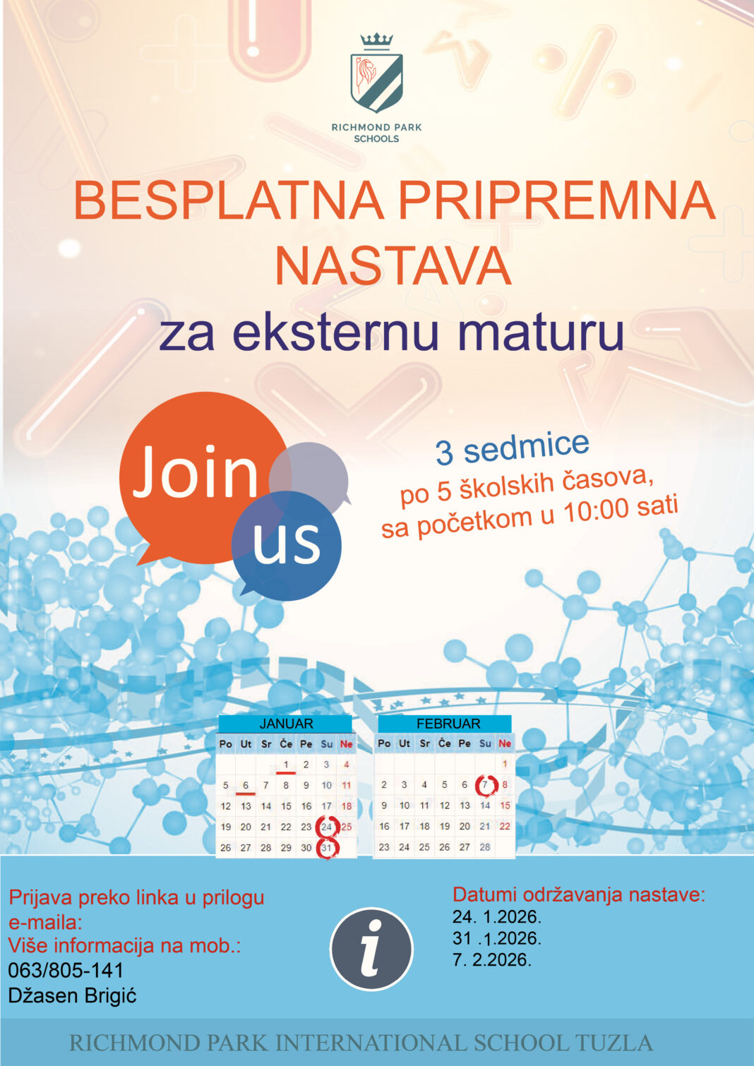 Richmond Park Međunarodna srednja škola u Tuzli će u periodu od 24. januara do 7. februara 2026. godine realizovati projekat pod nazivom “Besplatna pripremna nastava za eksternu maturu” za učenike devetih razreda sa područja Tuzlanskog kantona.