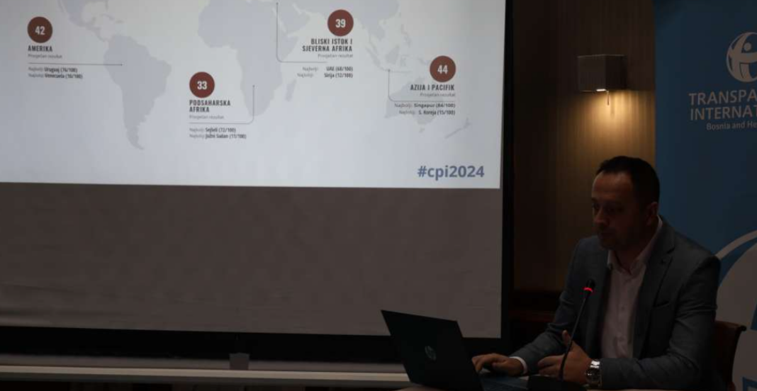 Izvršna direktorica TIBiH Ivana Korajlić i menadžer za odnose sa javnošću TIBiH Srđan Traljić predstavili su Indeks percepcije korupcije za 2024. godinu, napominjući da je fokus globalnog istraživanja CPI bio uticaj korupcije na životnu sredinu.