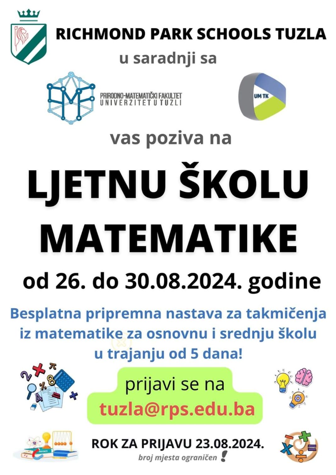 Richmond Park Međunarodna škola Tuzla, u saradnji sa Prirodno-matematičkim fakultetom Univerziteta u Tuzli i Udruženjem matematičara Tuzlanskog kantona, organizuje Ljetnu školu matematike od 26. do 30. augusta 2024. godine.