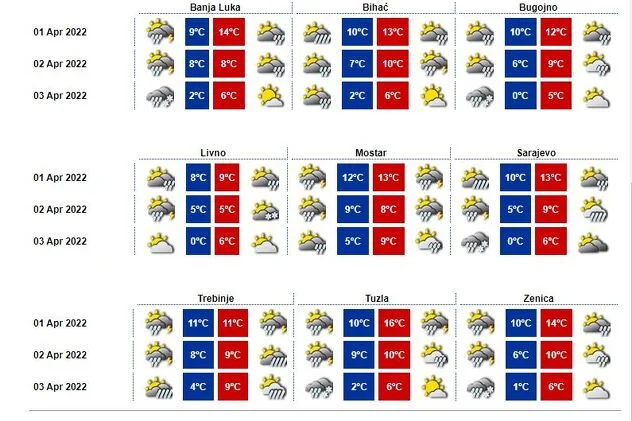 Prekosutra (nedjelja) će također biti pretežno oblačno vrijeme. U Bosni prolazno slabije padavine prije podne, a u Hercegovini slaba kiša će padati veći dio dana. Vjetar slab do umjerene jačine sjevernog i sjeverozapadnog smjera. Jutarnja temperatura zraka većinom između 1 i 5, na jugu zemlje do 8, a najviša dnevna temperatura zraka uglavnom između 3 i 7, na jugu zemlje do 11 stepeni.
